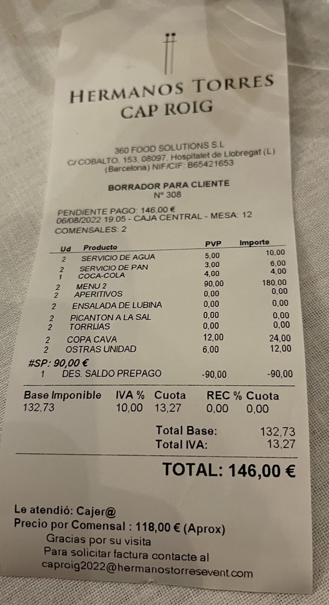 Una usuària de Twitter, Cătălina Ionescu (@LinaIonescu) ha publicat al seu perfil la seva experiència en el sopar que els cuiners coneguts com els germans Torres varen oferir aquest cap de setmana passat al Festival Cap Roig de Palafrugell (Catalunya).
