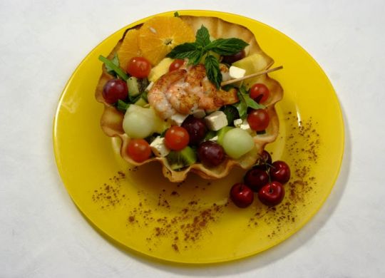 Creps farcits de pollastre de raça Pota blava a la catalana amb prunes i pinyons