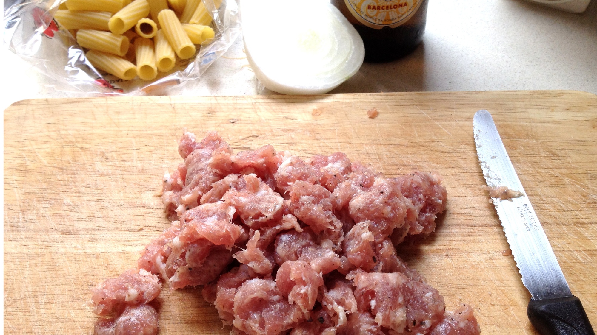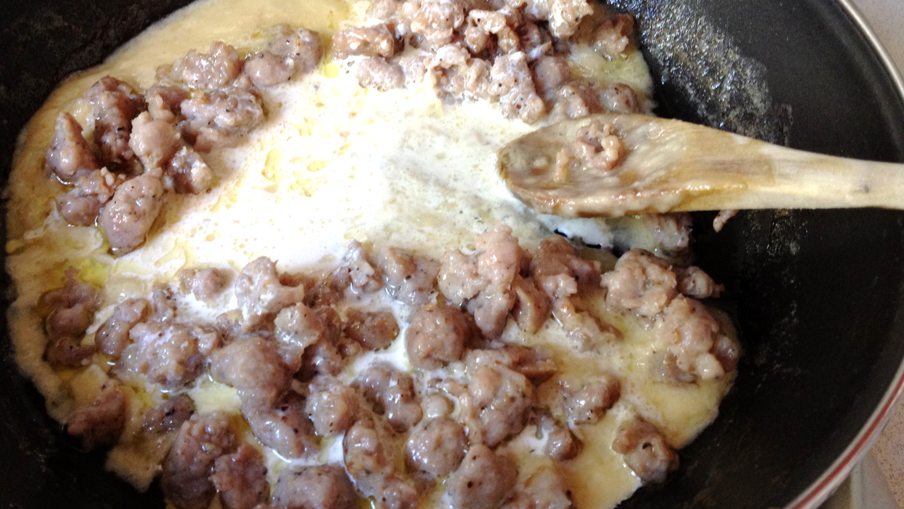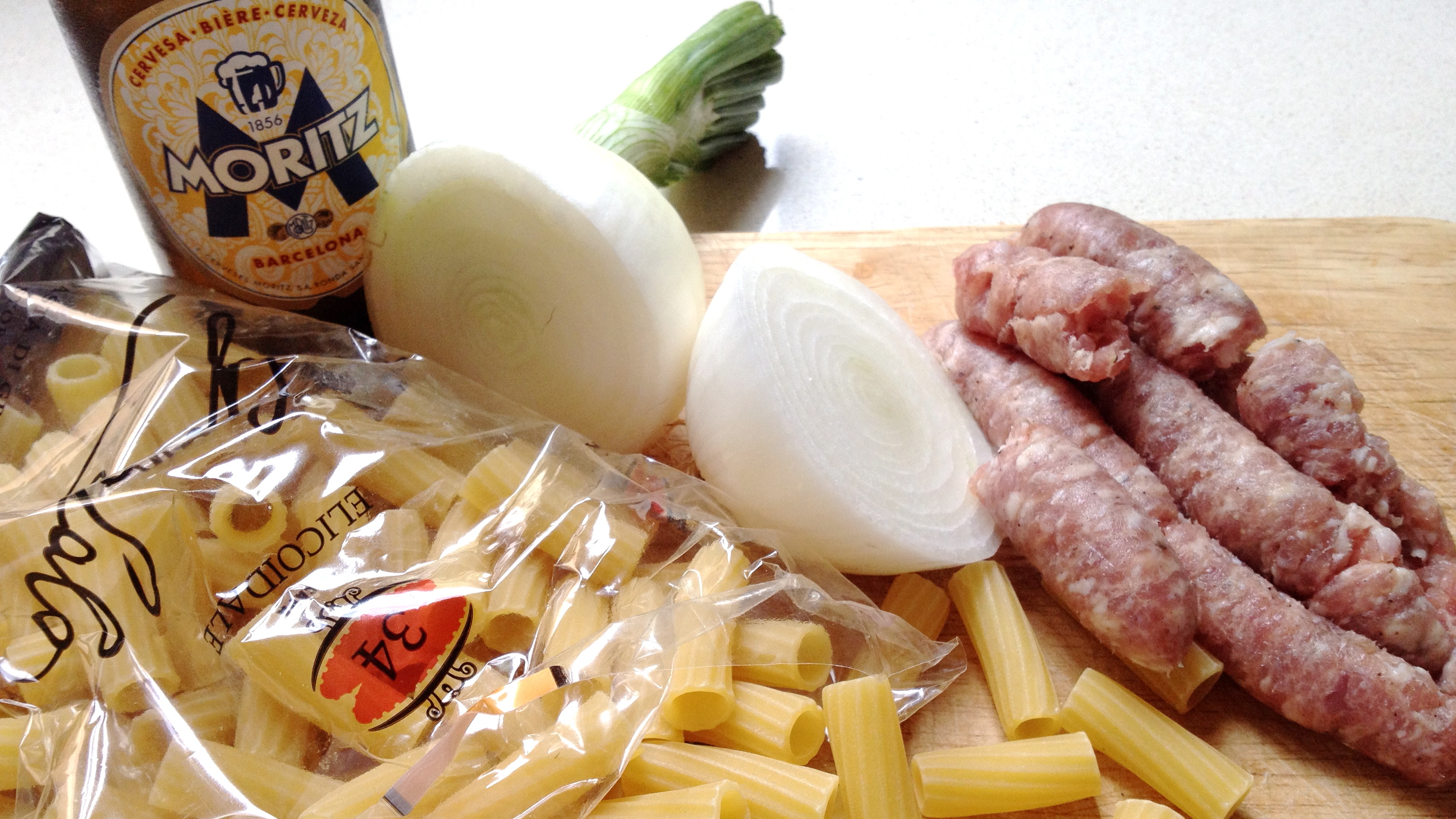 Abans que la ceba agafi color, afegiu-hi la cervesa i deixeu que s’evapori, sense tapa i amb flama fluixa, de manera que la ceba tingui temps de coure’s. Quan la cervesa s’hagi reduït, passau el contingut de la paella pel minipimer. Tornau a abocar a la paella la crema de ceba i cervesa, la salsitxa, 3 cullerades de nata (no us passeu amb la nata si no matareu el gust amarg de la cervesa) i unes fulles de romaní. Tapau, deixeu que faci xup xup 3-4 minuts a flama baixa i apagueu el foc.