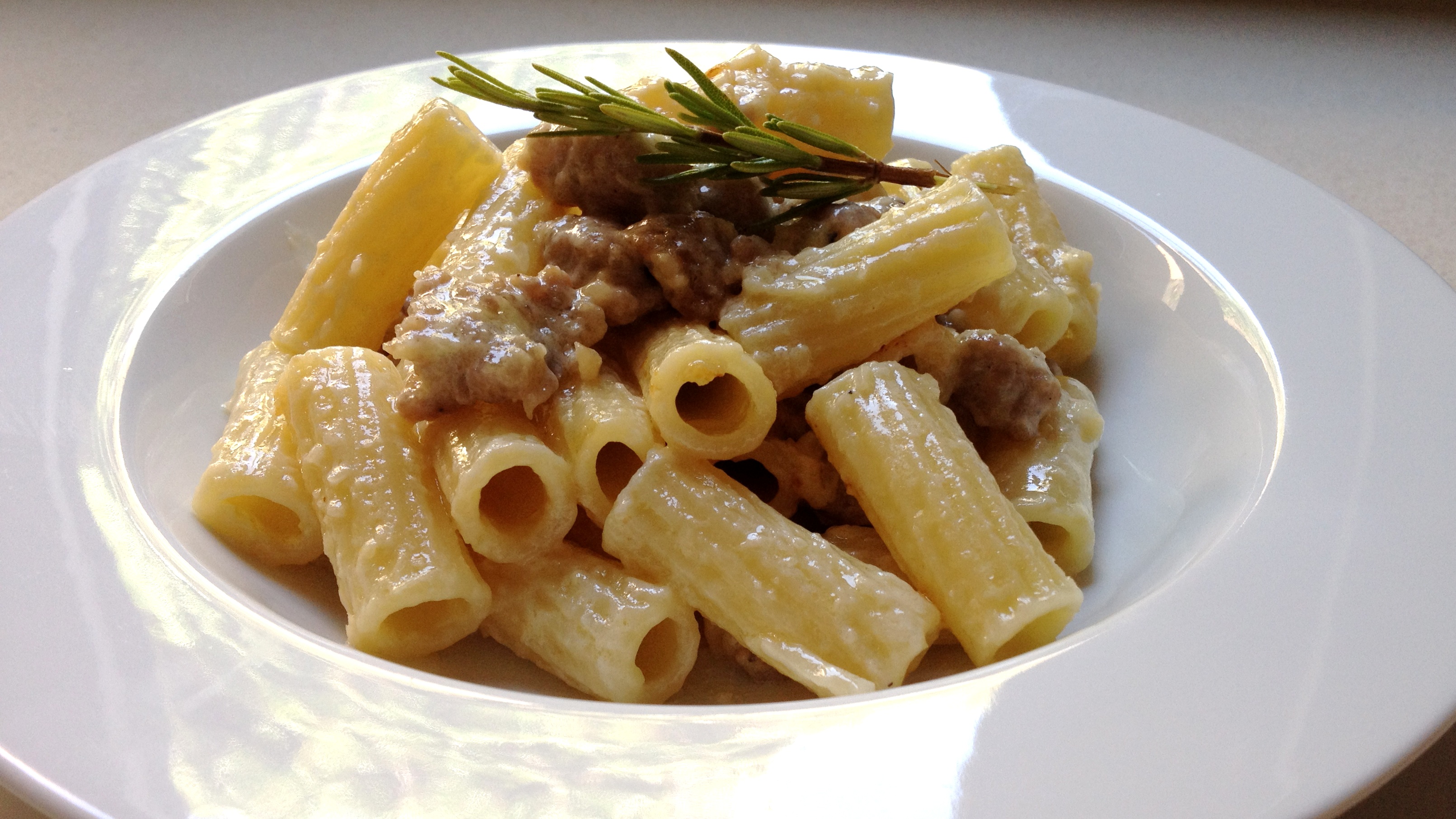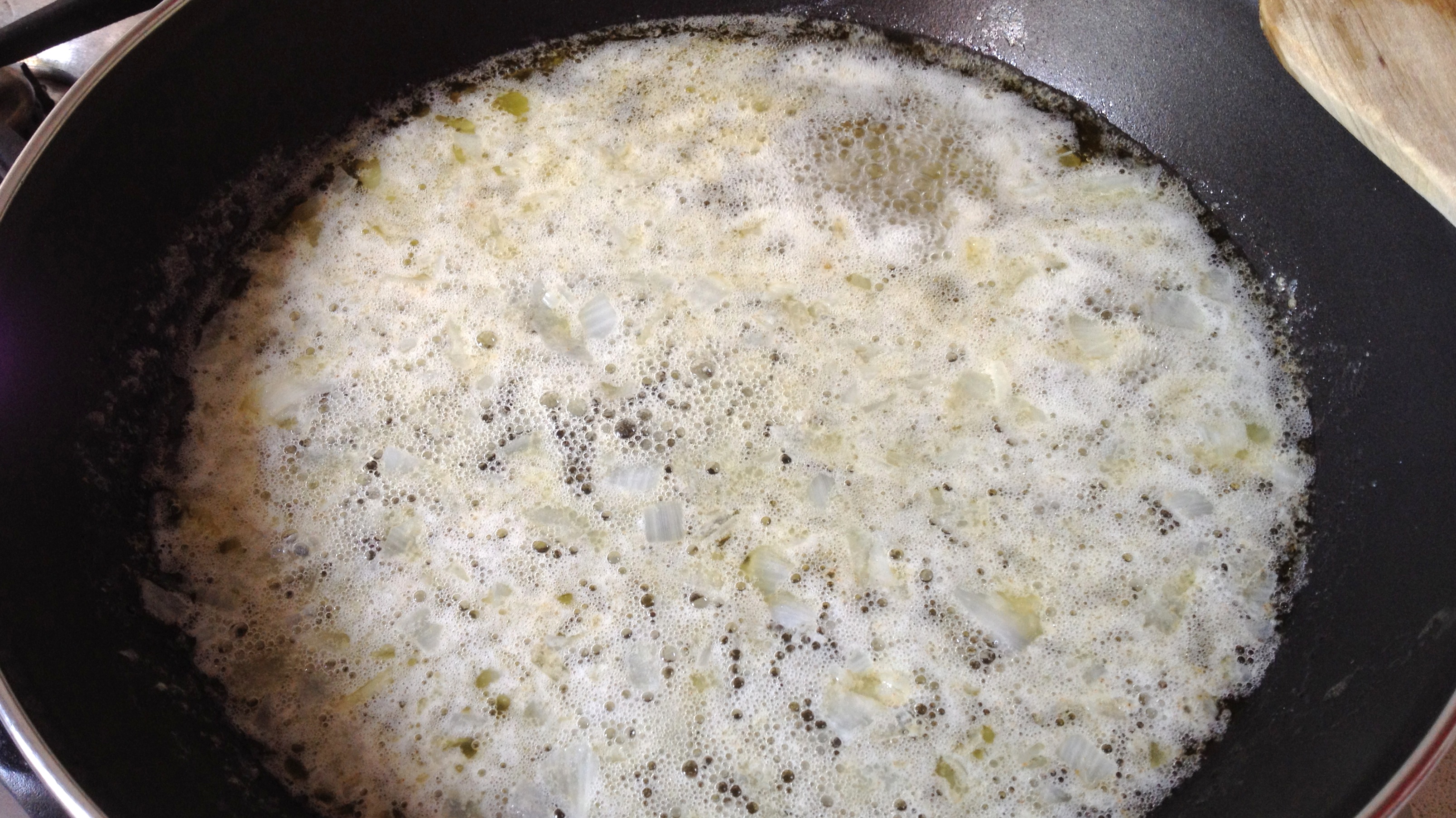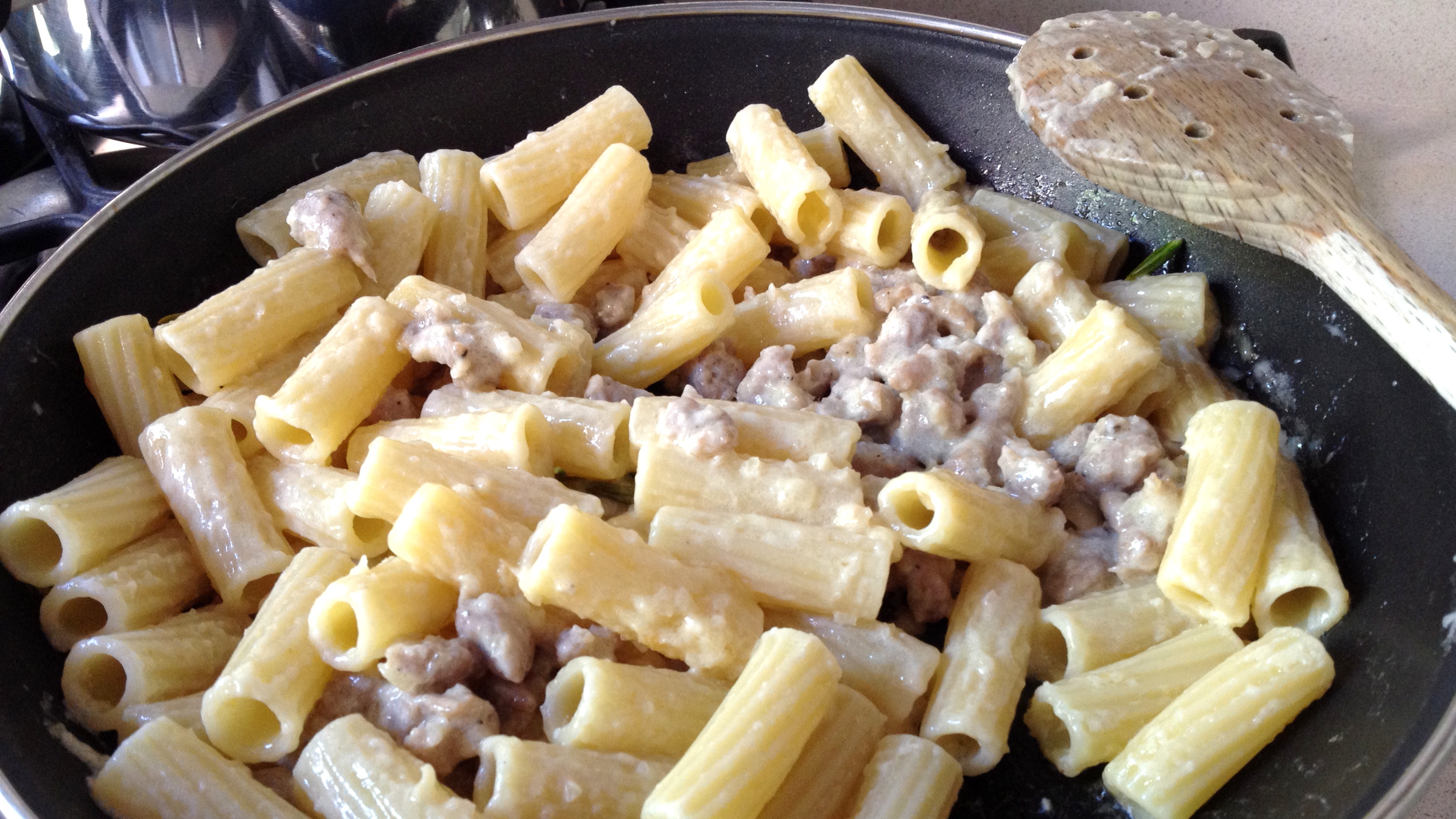 Abans que la ceba agafi color, afegiu-hi la cervesa i deixeu que s’evapori, sense tapa i amb flama fluixa, de manera que la ceba tingui temps de coure’s. Quan la cervesa s’hagi reduït, passau el contingut de la paella pel minipimer. Tornau a abocar a la paella la crema de ceba i cervesa, la salsitxa, 3 cullerades de nata (no us passeu amb la nata si no matareu el gust amarg de la cervesa) i unes fulles de romaní. Tapau, deixeu que faci xup xup 3-4 minuts a flama baixa i apagueu el foc.