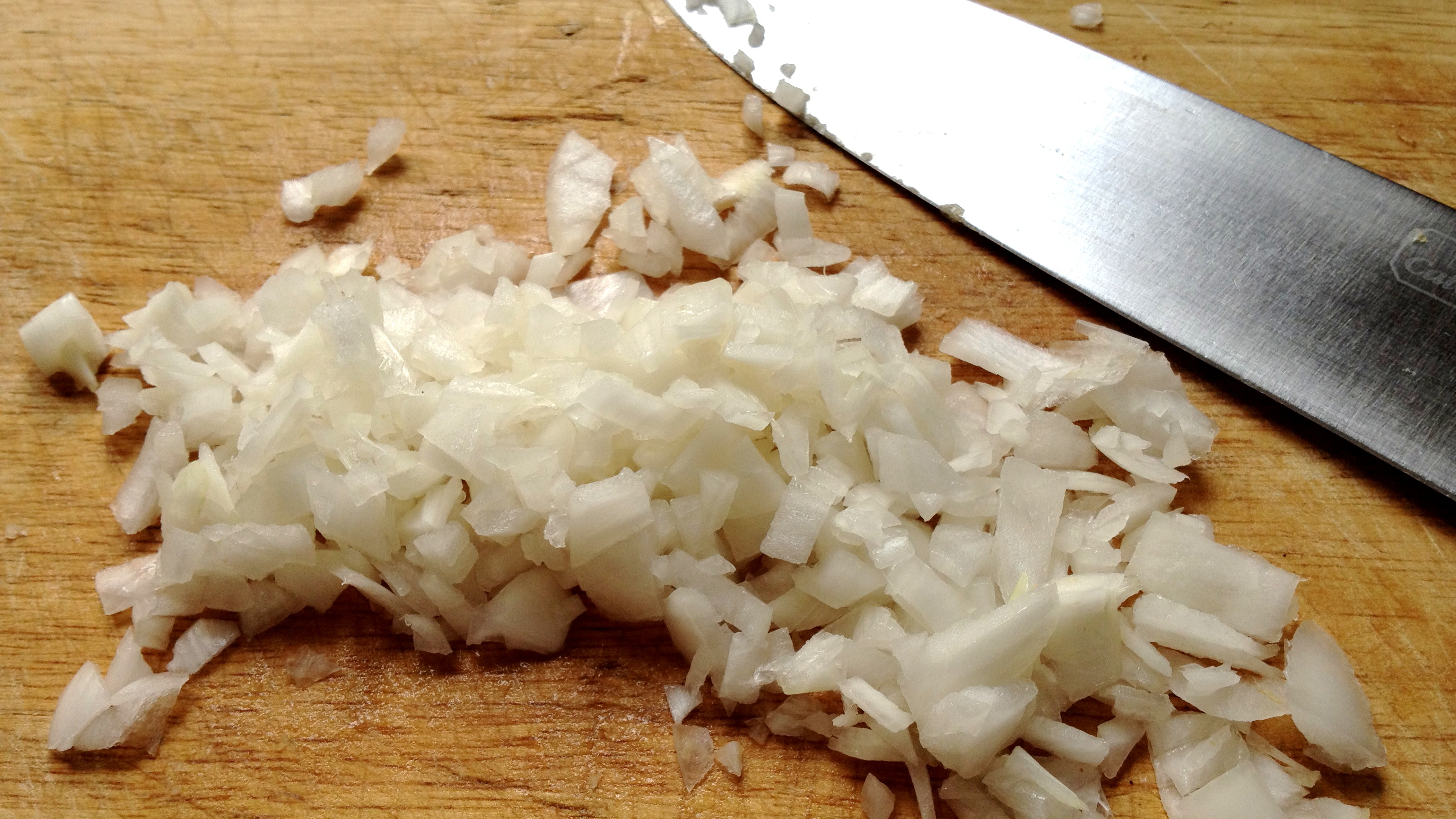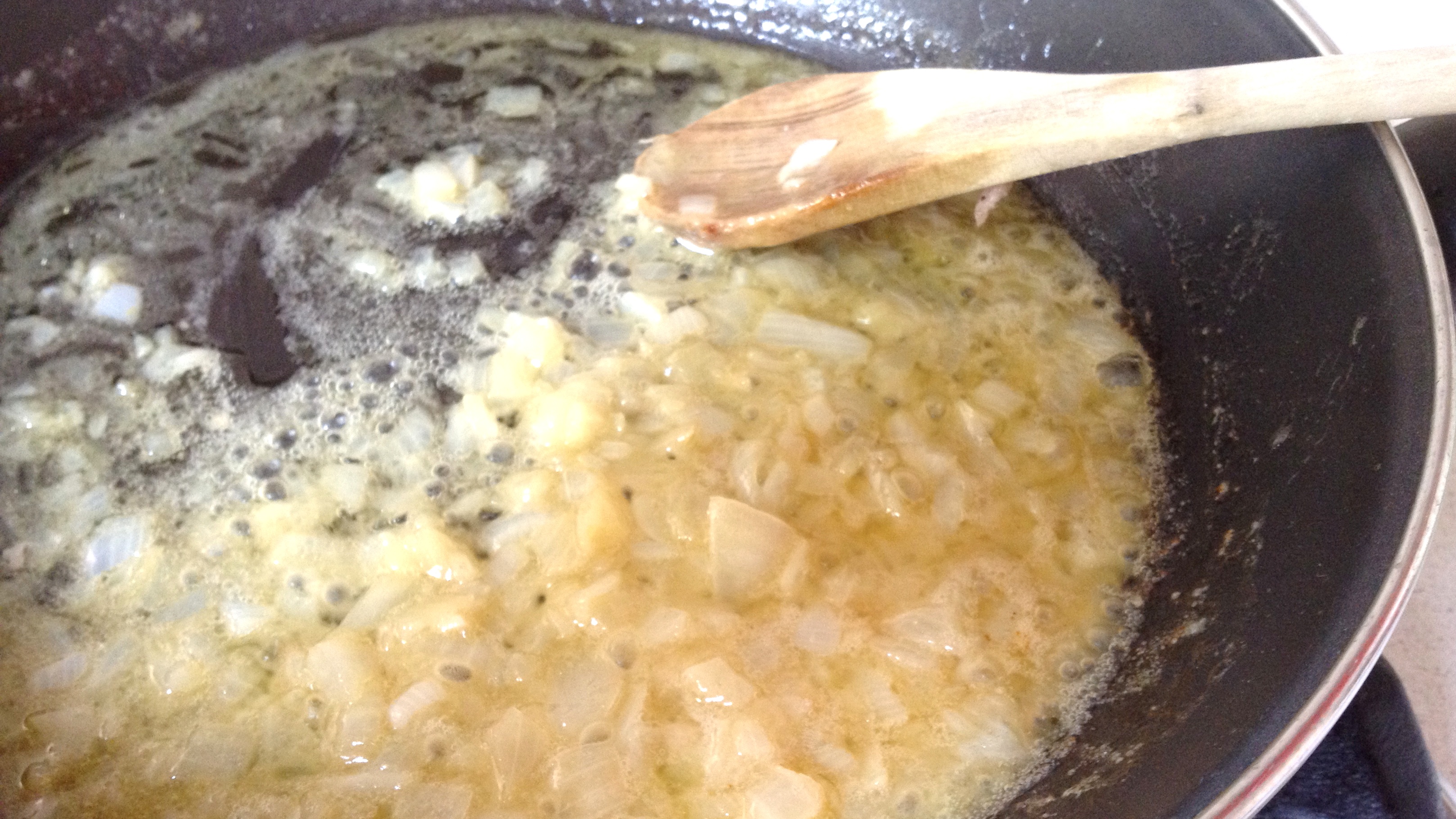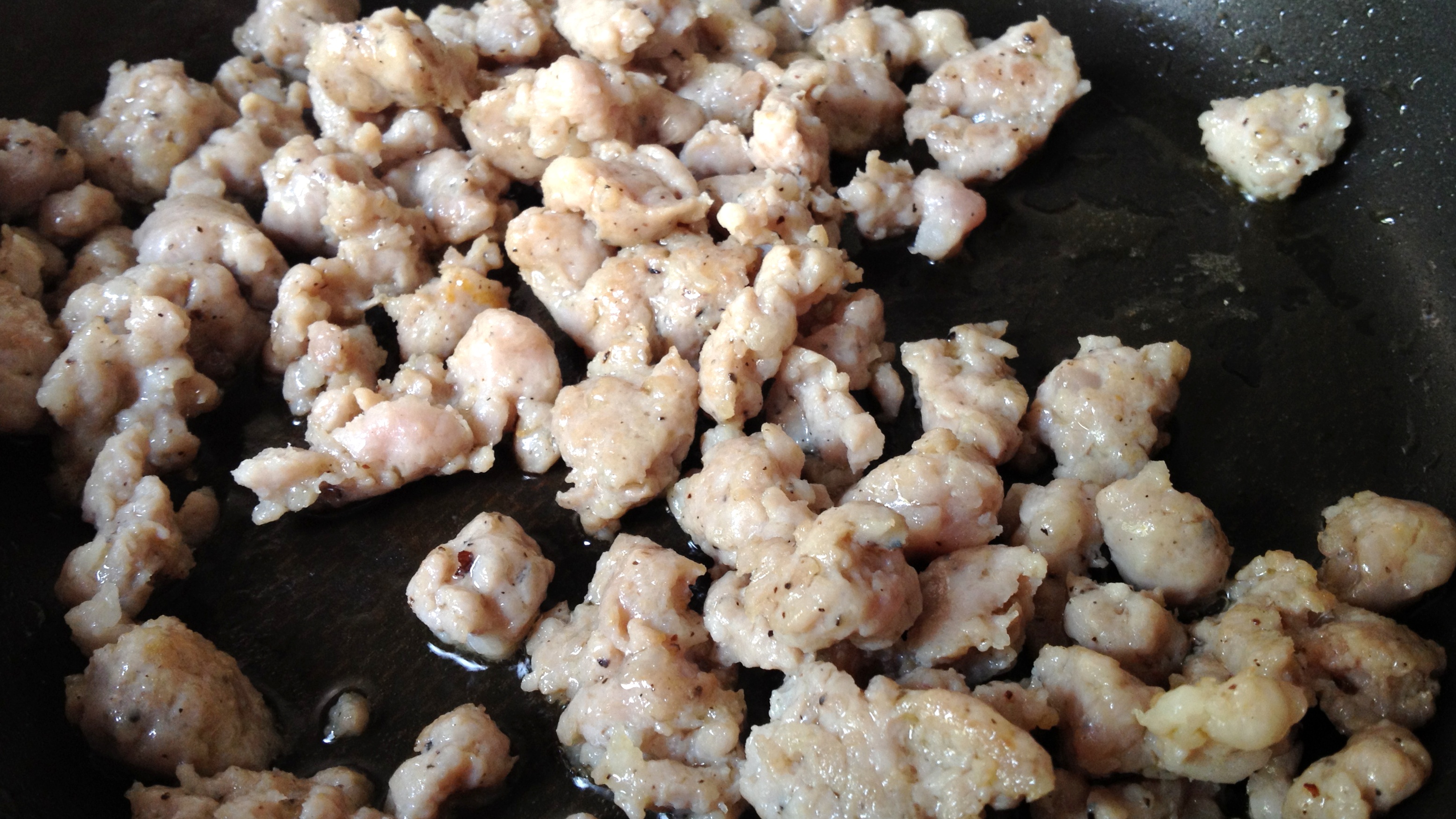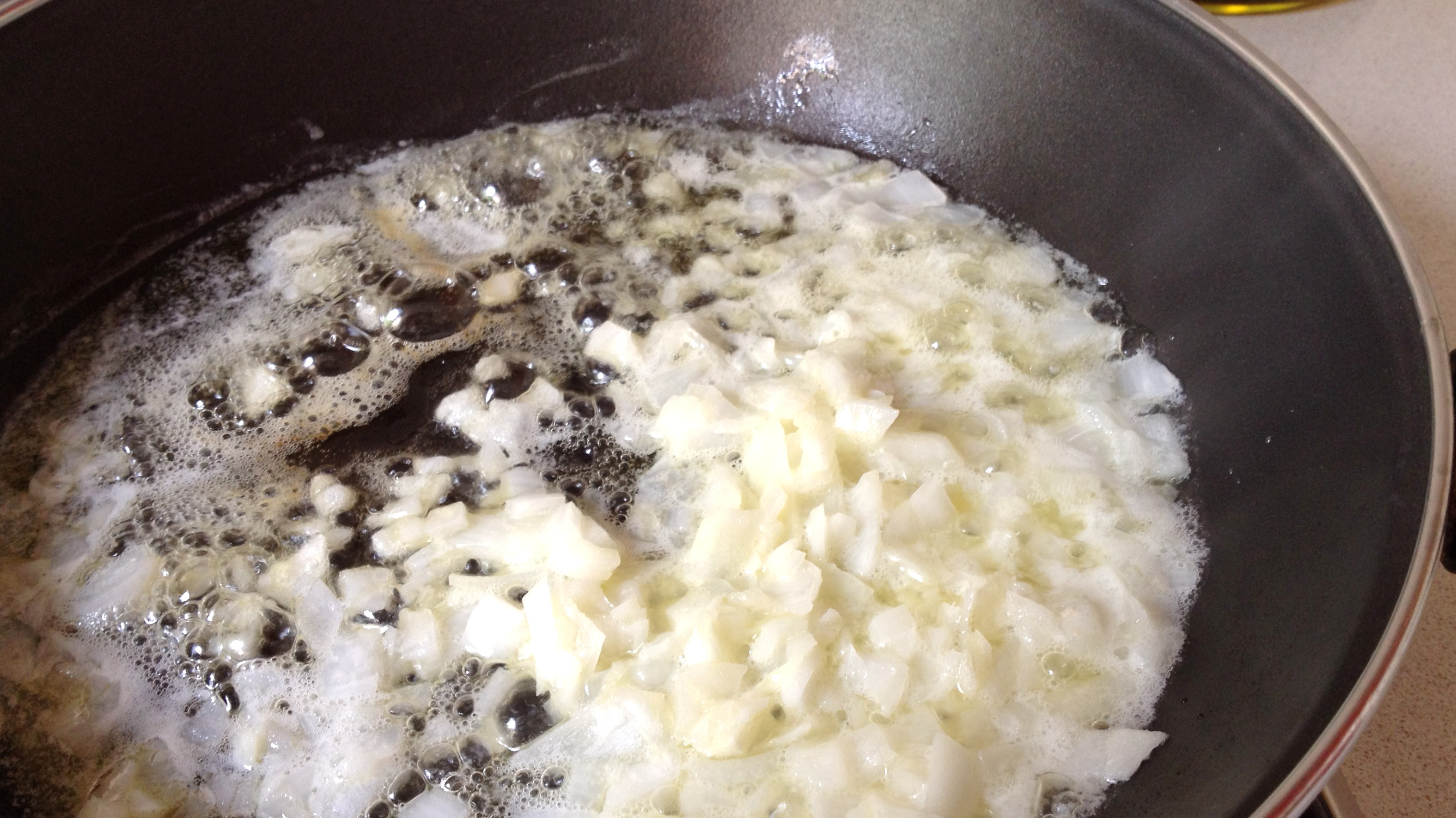 Per començar, treieu la pell a la salsitxa, esmicoleu-la i coeu-la en una paella amb un raig d’oli (molt poc) i deixau-la a part. Després, tallau la ceba a trossos i posau-la en una paella ampla amb la mantega (que pot ser la mateixa on heu cuit la salsitxa).
