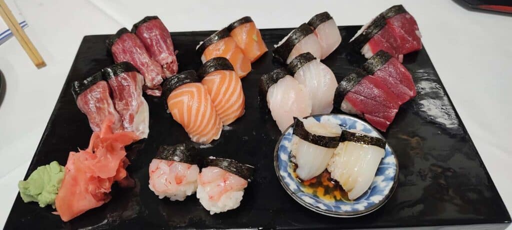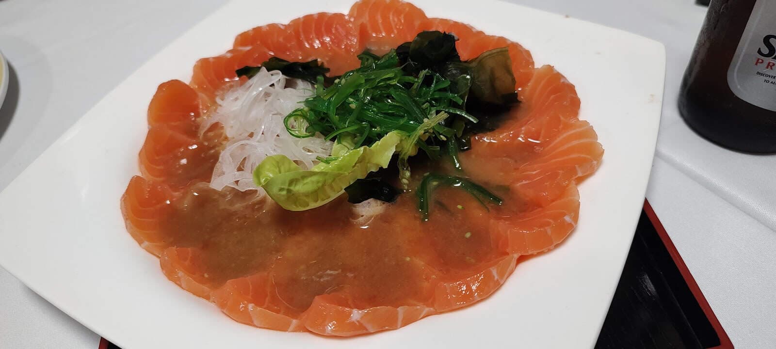 Com a entrant, sol ser gentilesa de la casa, us oferiran una espècie d’ensalada russa. A la carta, hi trobareu plats com el misoshiru (sopa amb algues i tofu), el gyusashi (carpaccio japonès), sushi amb pernil d’aglà, yakisoba (pasta amb verdura, carn i gambes), pollastre arrebossat o el variat de sushi (amb calamar, salmó, tonyina…), entre d’altres.
