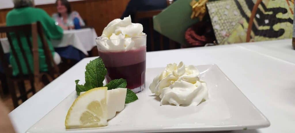 Pel que fa a l’oferta de postres, és senzilla. Bàsicament són gelatines de gustos diferents, com ara de vi negre o de xocolata o de fruita.