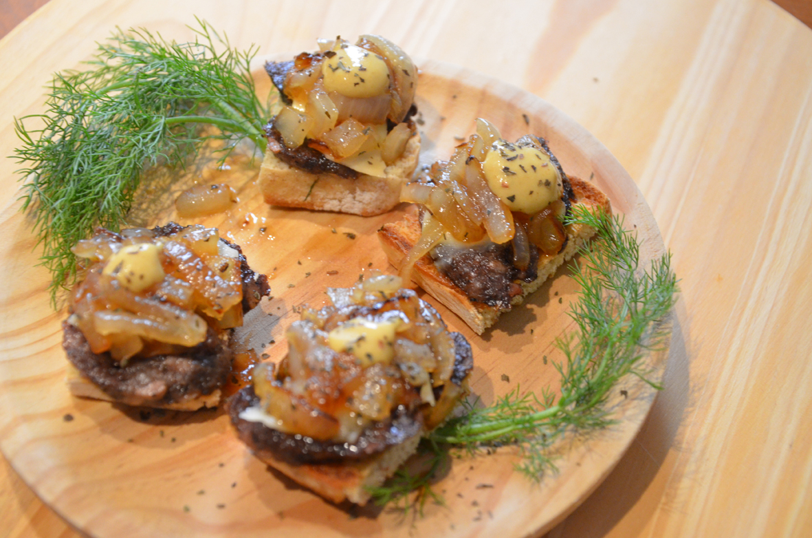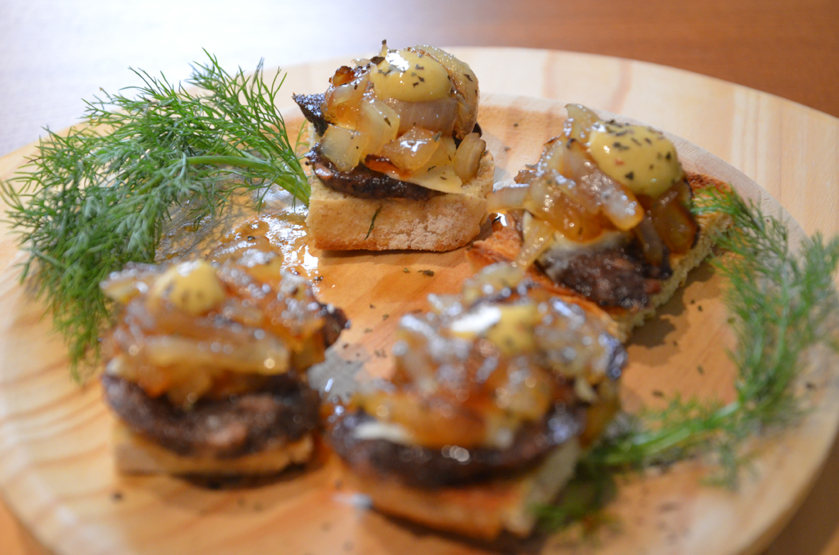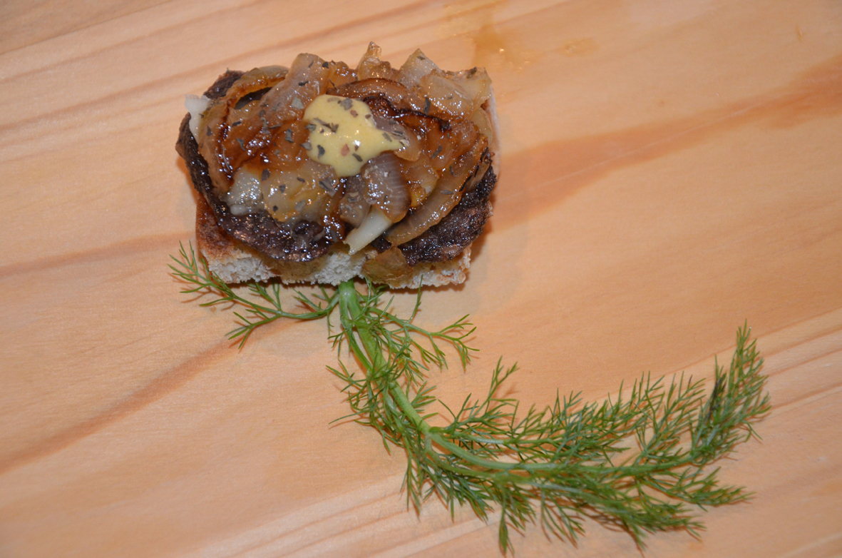 L’ordre de la tapa serà el següent: pa torrat, botifarró a la planxa, rodanxa de formatge, ceba confitada i gota de mostassa.